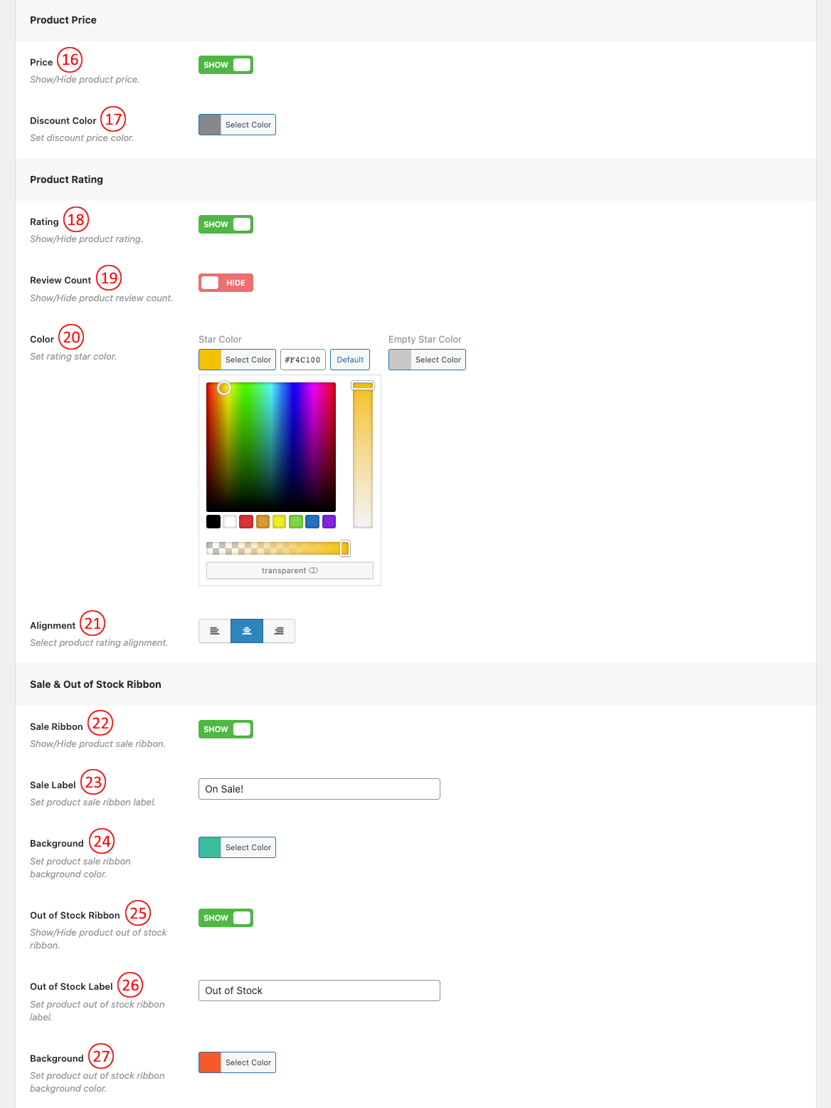 (20) Color: Choose a Color for the Product Rating Star. You can also set Empty Star Color.