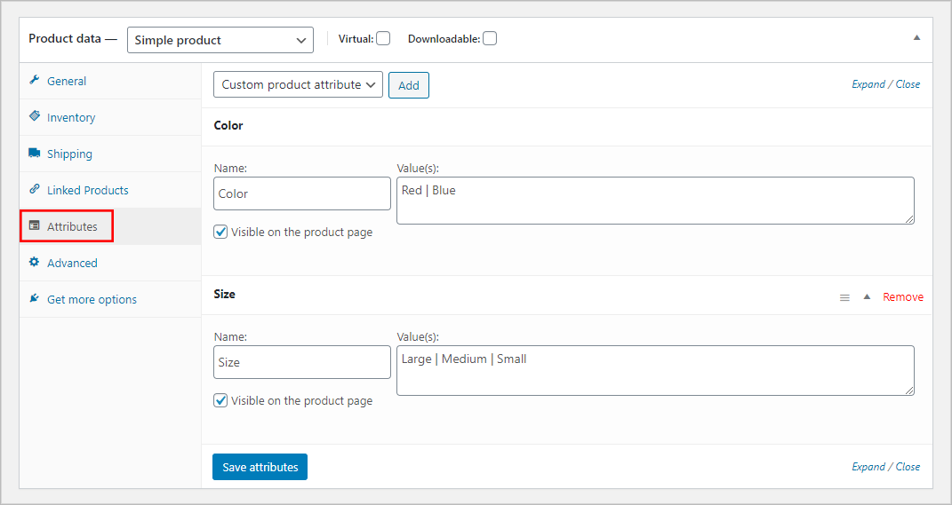 Attributes are also useful for searching and filtering products. If you give attributes to products, users can filter using them. Often this filtering is done by WooCommerce widgets that allow users to filter products. Attributes are confused with Variations but they are different. Variations are not for searching or filtering. Variations allow users to choose different options for a product. This means you can sell a T-Shirt in different sizes and colors. Part of the confusion is that Attributes and Variations often rely on each other to work effectively. For example, variations are based on attributes. Creating attributes is an essential first step before creating variations. To create and set the attribute to your product follow the instructions: