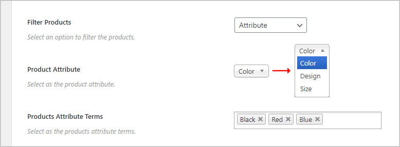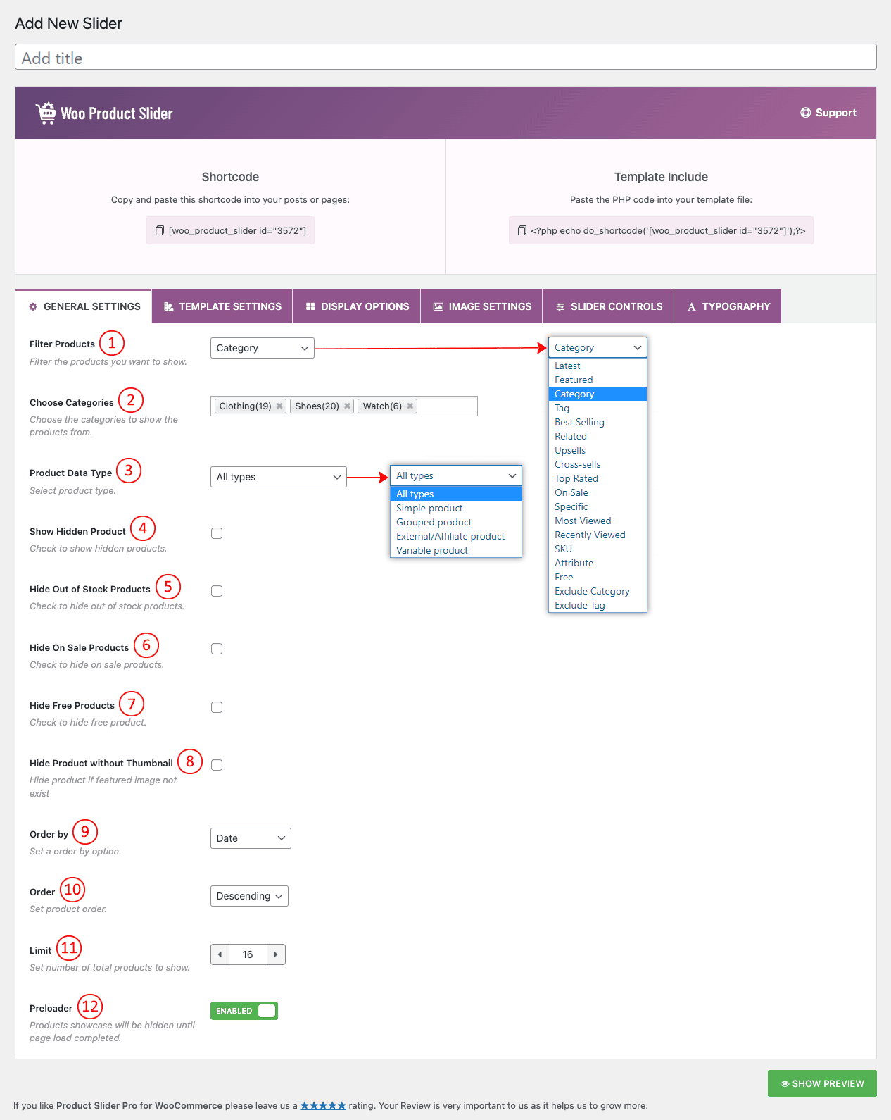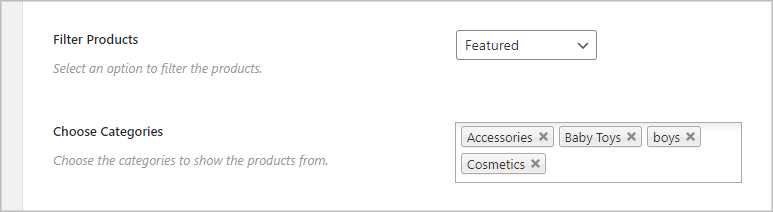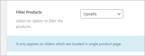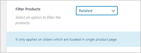 (1) Filter Products: Select any filter to specify which product type you want to display on the slider. You can choose from 18 different filter options. They are: