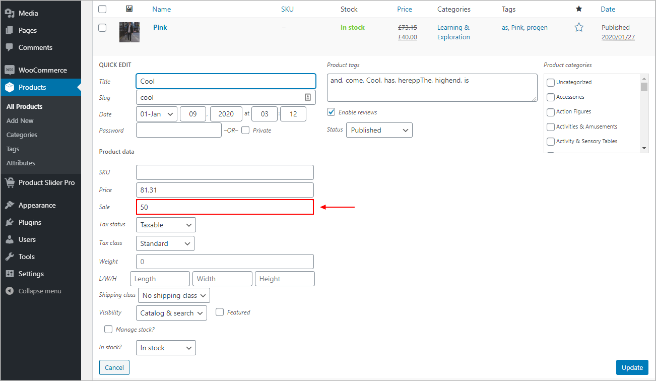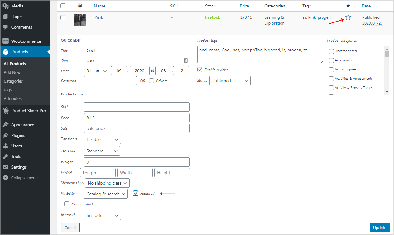(ii) Featured: Featured products permit you to display specific products in various parts of your online store. You can control them by switching them on and off. To mark a product as featured, go to Products → All Products and select the Star in the featured column. Alternatively, select Quick Edit and then check the Featured option. You can create a featured product carousel with this option.