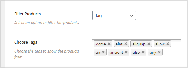 (iv) Tag: Product tagging is the way to organize and identify products with special features or information the customer may need. Tags can also help provide metadata about your site to search engines for better placement in search results. Tag options are virtually limitless. You can assign as many or as few tags as necessary to help organize and describe your products. You can create a product slider by selecting the product tag with this option.